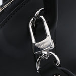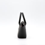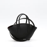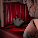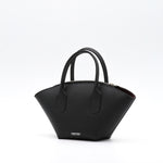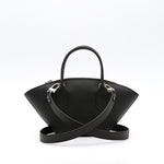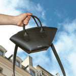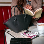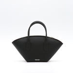 Le EMMA est un sac en cuir de veau noir à la silhouette en éventail. Poignées à enchape et fermeture à glissière pour un design structuré, fonctionnel et intemporel.